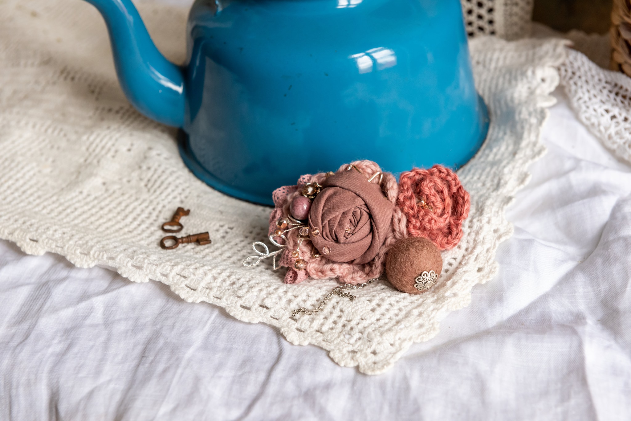 Broșă compusă din floare tricotată, material textil și bilă de fetru. Este decorată cu mărgeluțe și împreună formează un accesoriu vintage și delicat potrivit pentru țesături dense și tricotaje de iarnă. Ideală pe o haină sau o eșarfă.