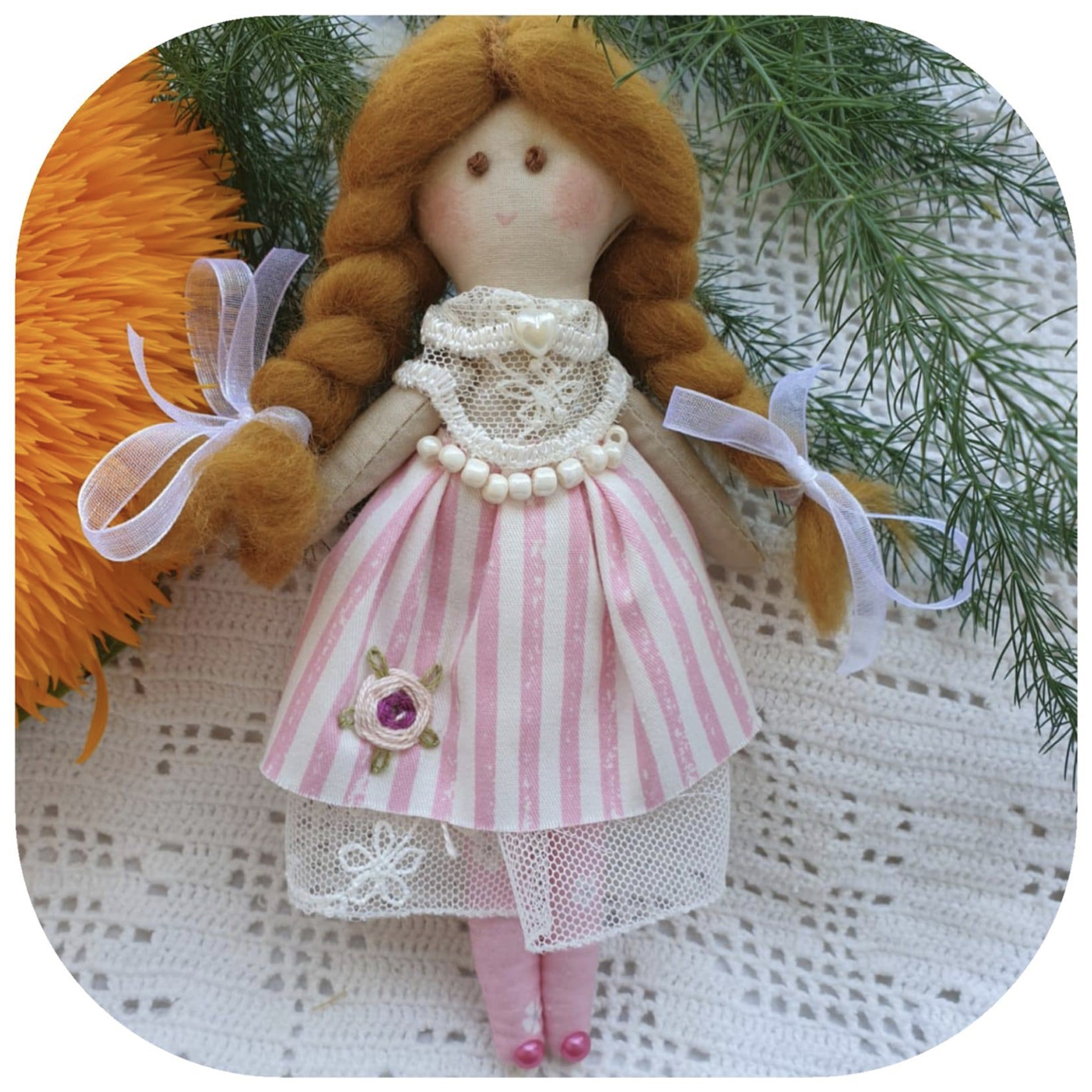 Păpușă realizată manual după propriul tipar. Păpușa este cusută din material de bumbac sau in, iar ținutele ți accesoriile sunt bine alese. Frumusețea păpușilor constă în părul arănjat cu dichis, obrăjorii pictați, rochiile în straturi și accesoriile uneori foarte elaborate, cărora li se adaugă adesea o broderie foarte delicată. Acest aspect le conferă o expresivitate aparte. Abia așteaptă să fie îndrăgită!