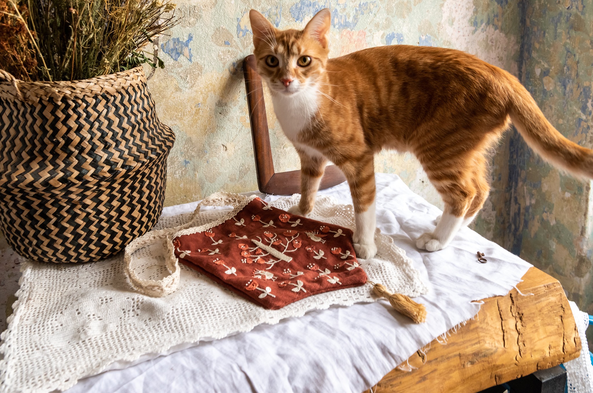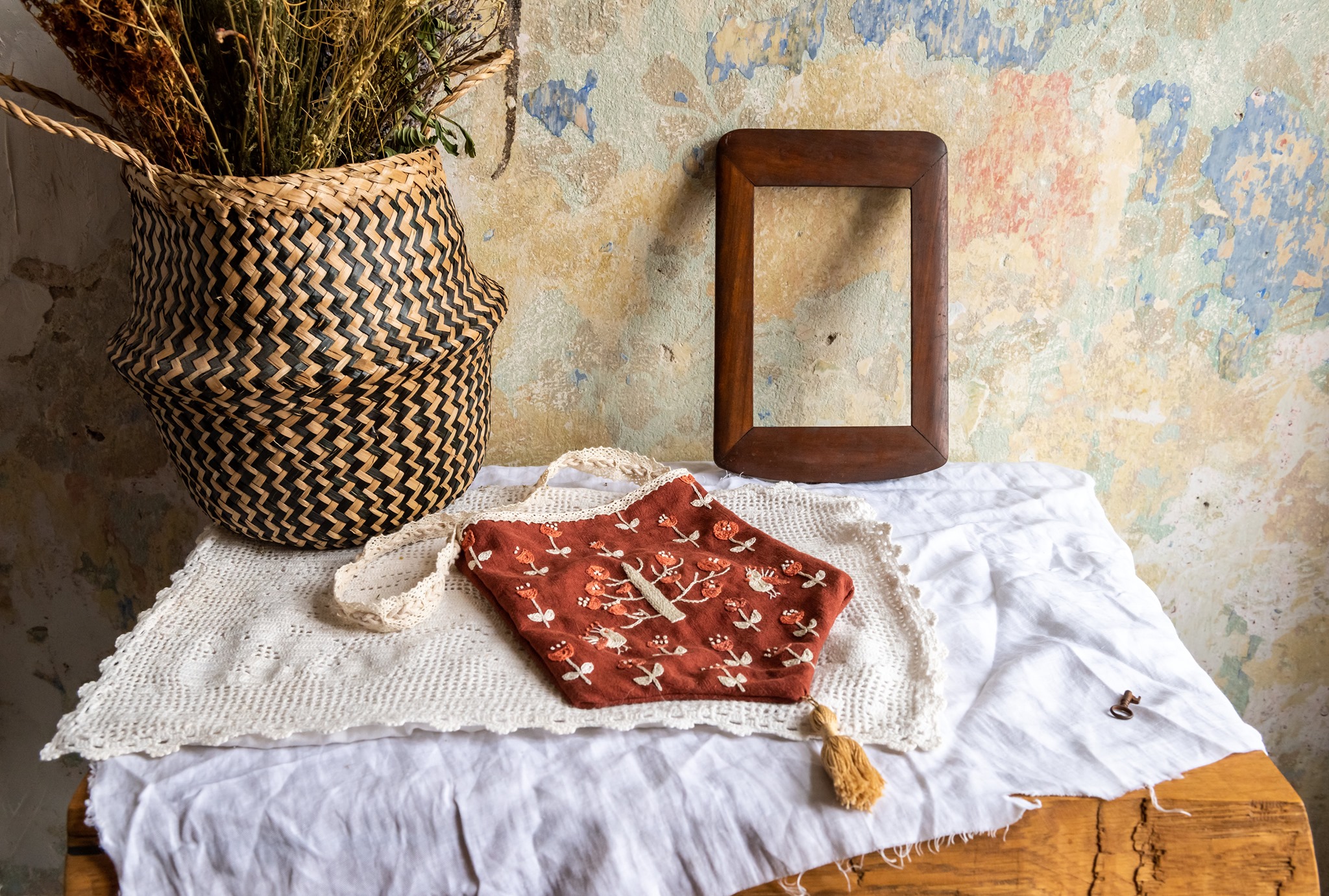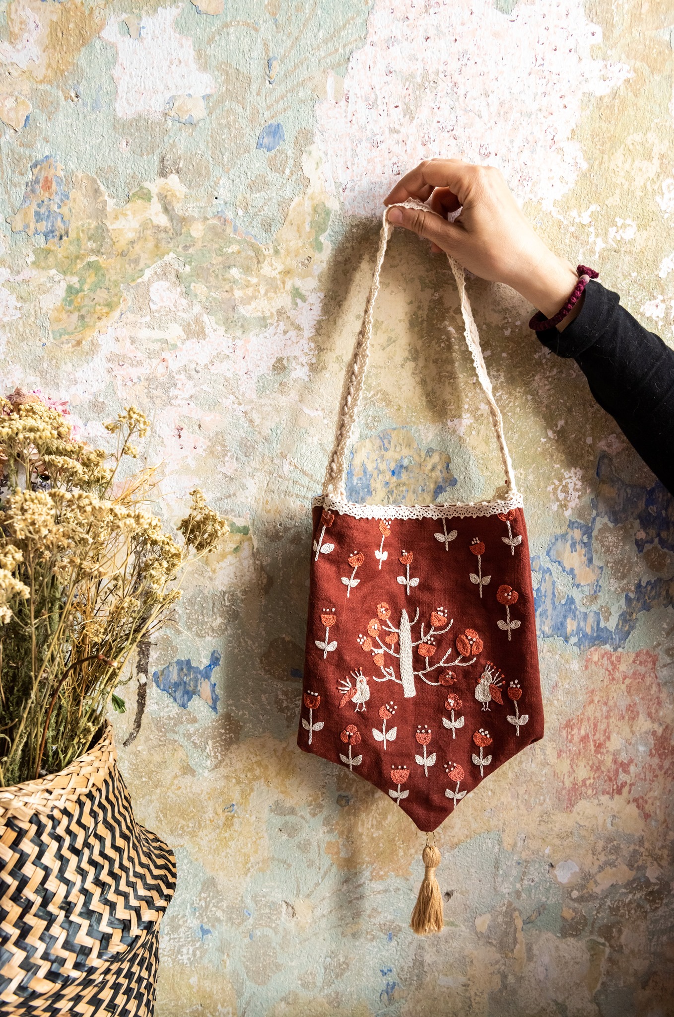 O mică traistă din in cu broderie manuală, într-un singur exemplar, cu un design unic inspirat din natură.